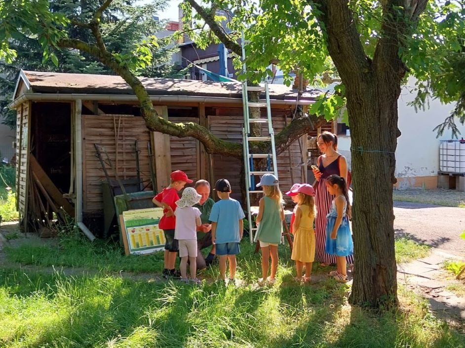 unseren Imkerfreund Matthias Vogel auf seinem Bienenstand in Merrane. Bei strahlendem Wetter konnten die kleinen Gäste
